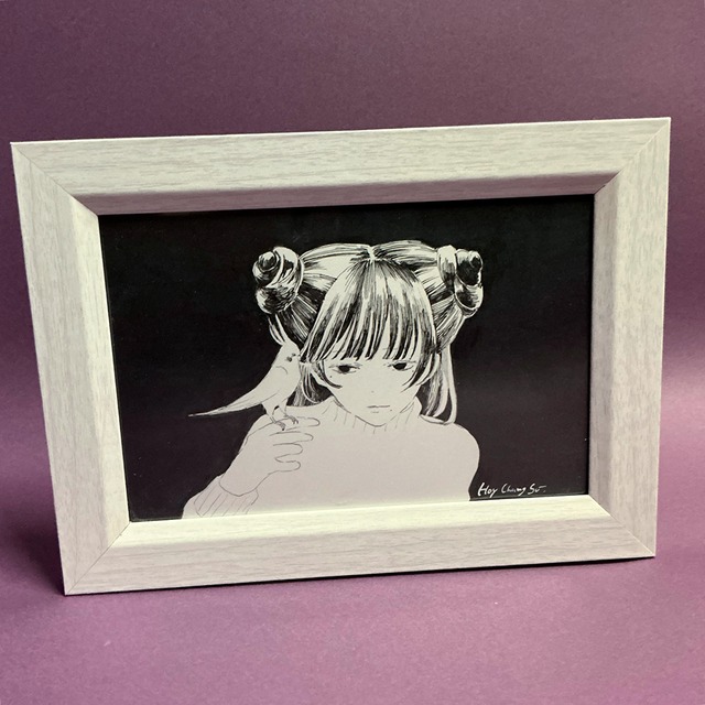 Hoy Chang Su楽曲オリジナルキャラクター「テリ子」ハガキサイズ(15.2×10.2cm)モノクロイラスト原画です。 ⚫︎今から応援してくれている方限定 Hoy Chang Su楽曲「某少女」のスペシャルステッカー付。 ---- ・簡易額装付き。 ・一点ものなので再販はございません。 ・色味など、お使いの端末や閲覧環境により、写真と実物の色味が多少異なって見えることがございます。 ・ハンドメイド作品になりますので、神経質な方はご購入をお控え下さい。 ・作品の著作権は作者に帰属します。無断転載、二次利用、転売は固くお断りいたします。 ・一点物のため、お客様都合による返品・交換はご遠慮ください。